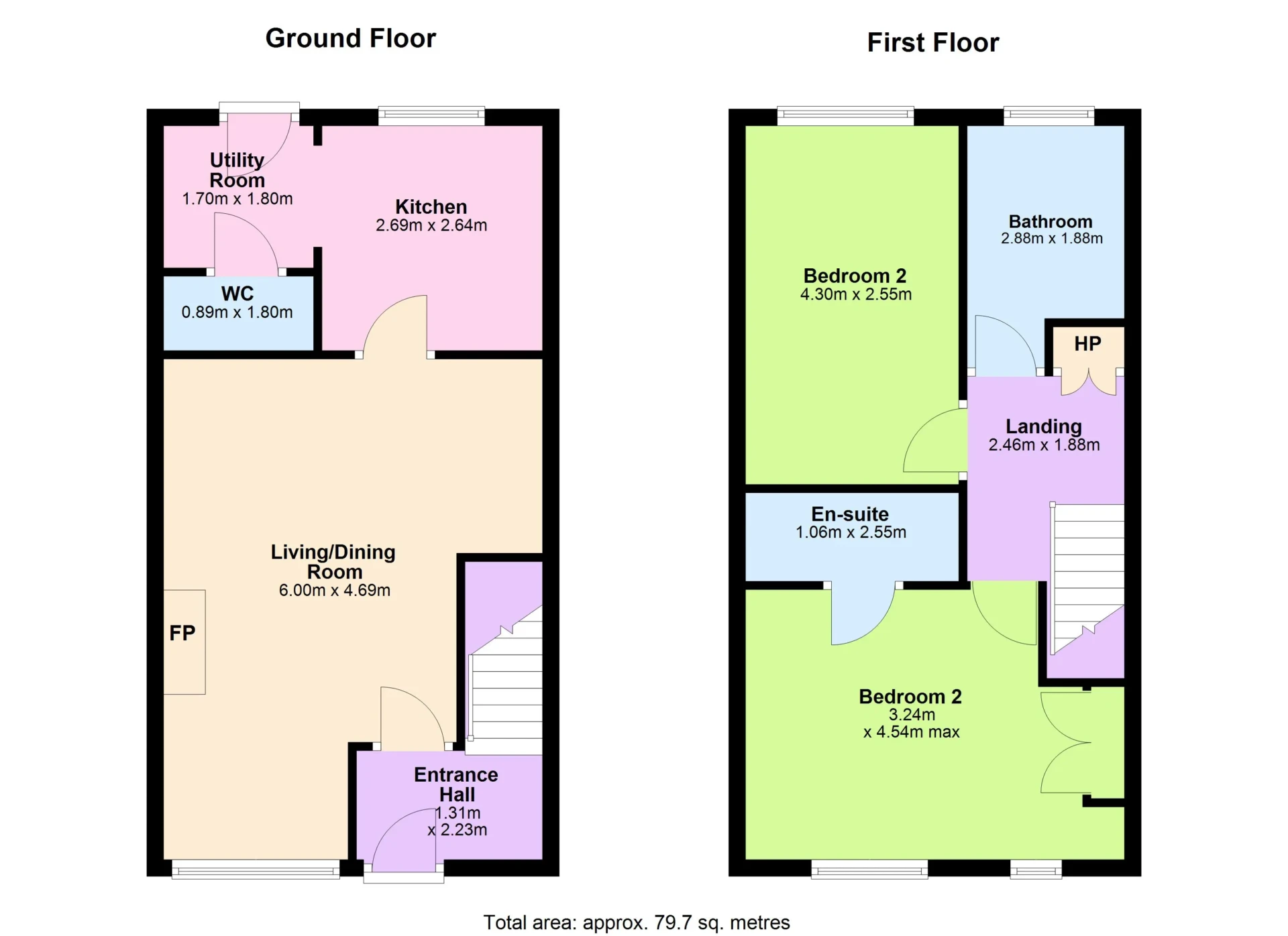 The accommodation is bright and thoughtfully laid out. An inviting entrance lobby leads into a large living room, featuring an open fireplace and plenty of natural light, which flows seamlessly into a modern fitted kitchen. From here, there is access to a convenient guest WC with wash hand basin, as well as a door opening to the rear garden. On the first floor, the property offers two spacious double bedrooms, with the main bedroom enjoying a private ensuite. A fresh, modern family bathroom completes the accommodation, providing practical and comfortable living.